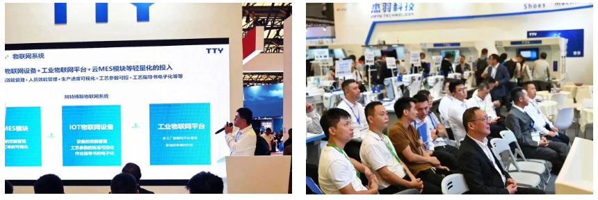 “數(shù)字化物聯(lián)網(wǎng)課堂”現(xiàn)場也吸引了大批觀眾到場傾聽鞋類面部成套智聯(lián)解決方案。